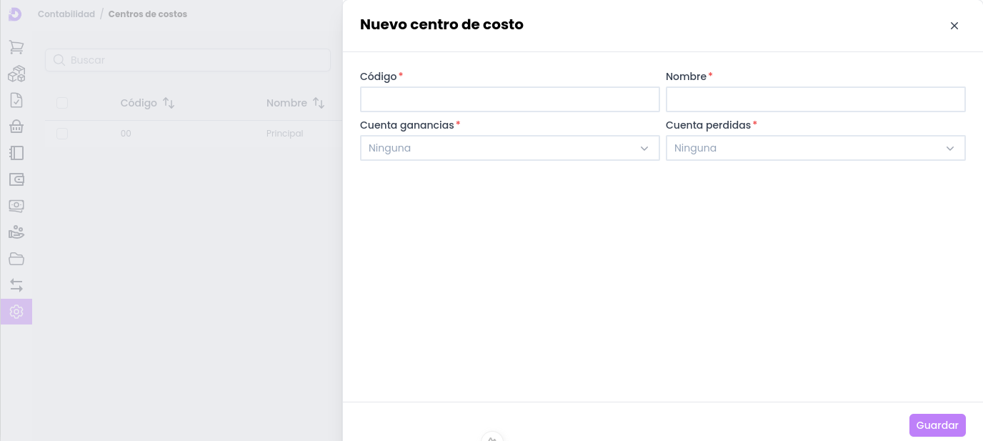 • Código del centro de costo: Número identificador que permite organizar los centros de costo en el sistema, facilitando búsquedas rápidas y precisas.