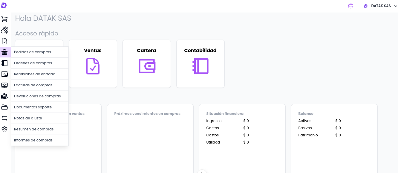 Se puede acceder a la opción de Notas de ajuste al ingresar en la unidad de negocio a gestionar, en la barra de menú, sobre el botón Compras y seleccionando la opciónNotas de ajuste.